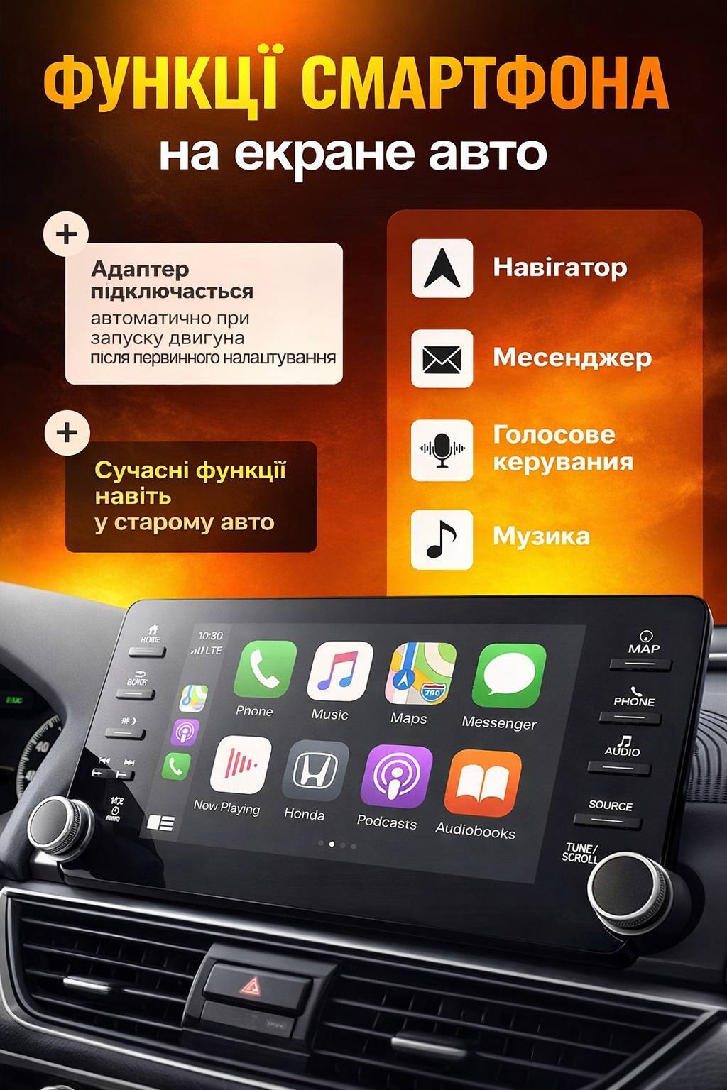 Сів у машину — і CarPlay або Android Auto вже працює.