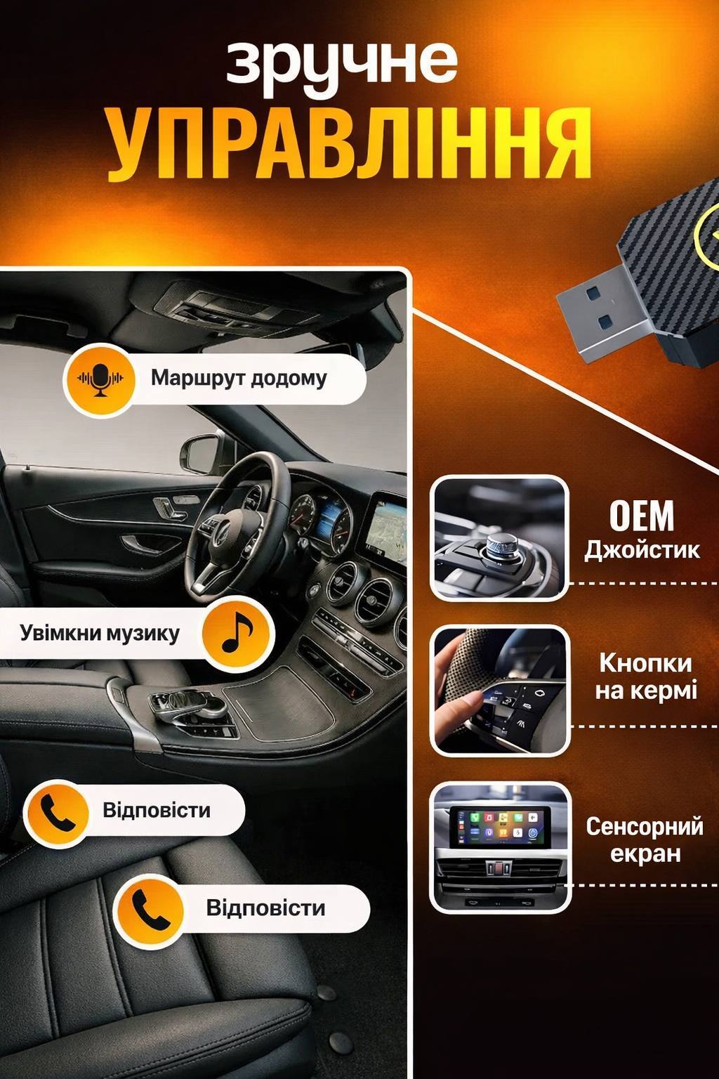 Під’єднується в USB-роз’єм — і надалі смартфон автоматично синхронізується через Wi-Fi та Bluetooth. Ви миттєво отримуєте доступ до навігації, музики, дзвінків, повідомлень та голосових функцій, без жодних проводів.