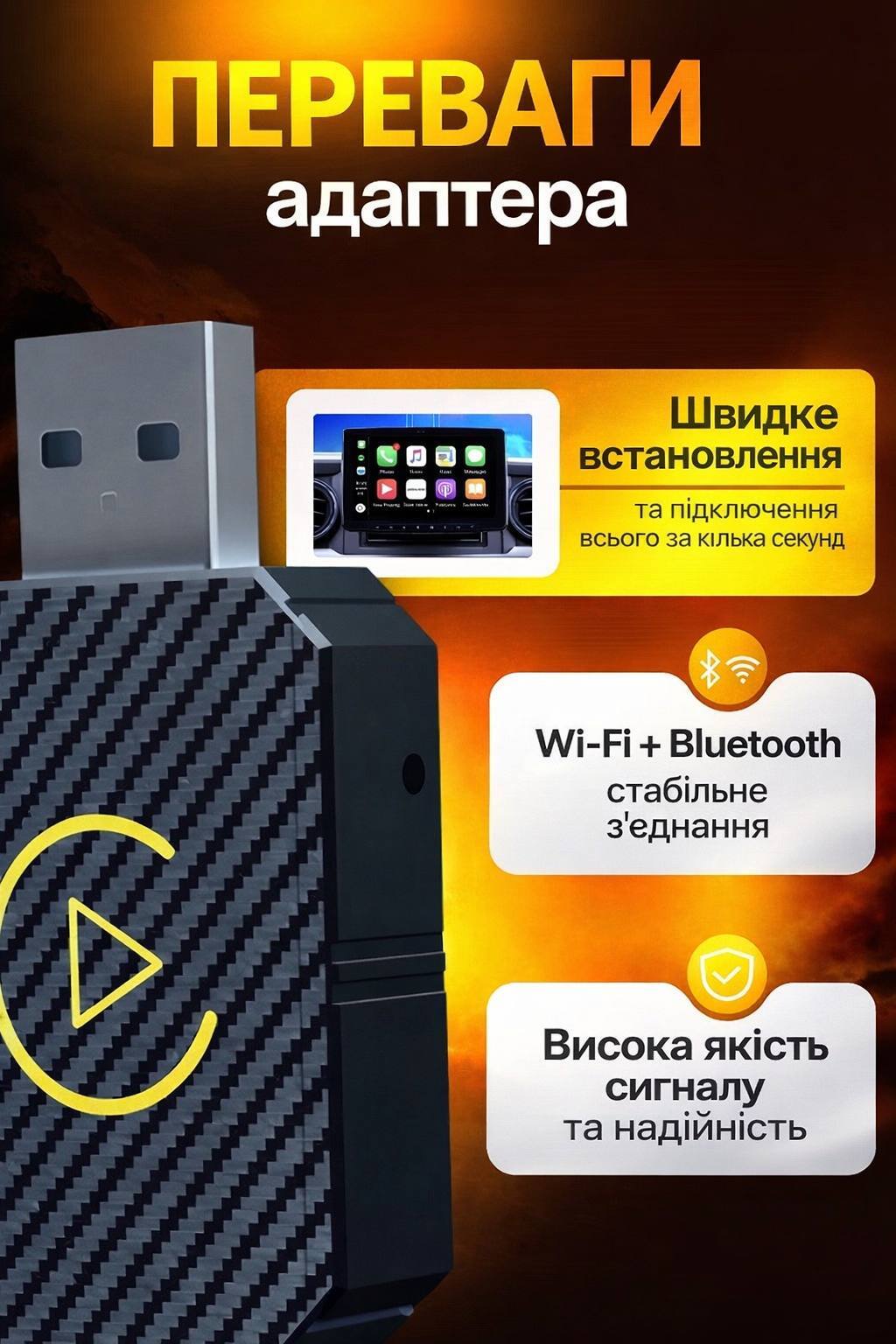 Дуже зручна штука! Під’єднав один раз — і тепер телефон сам підключається без проводів. Музика, карти, дзвінки — усе працює без затримок. Нарешті позбувся постійних кабелів у машині.